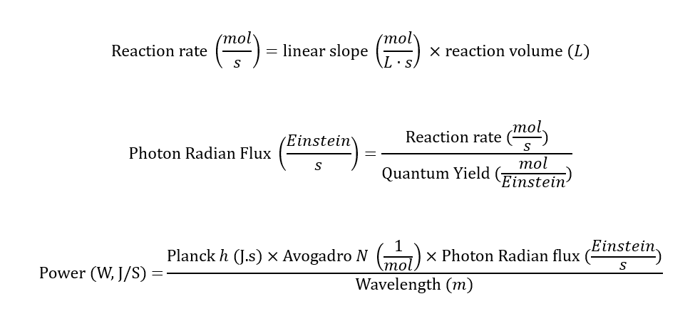 The increase of Fe2+ concentration is proportionate to the amount of photon absorbed and the slope of the line allows you to determine the rate of Fe2+ formation in mol/s. Accordingly, the photon radian flux in Einstein/s(the einstein is a unit defined as the energy in one mole of photons) can be determined using the quantum yield of ferrioxalate at the specified wavelength. Finally, Planck’s law allows us to determine J/s= W absorbed by the reaction solution. We have performed this measurement with concentrations diluted 4x and did not observe lower intensity readings. Therefore, we can conclude that all photons penetrating the solution are captured by the actinometer as concentration is not a limiting factor. See the formulas used for the calculations below: